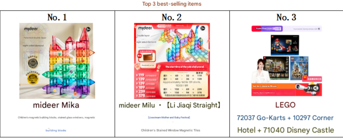 Lego multi-set bundles, Bandai mystery “lucky bags,” and baby feeding gift boxes appeared frequently on bestseller lists. This reflects China’s growing preference for ready-to-gift, value-added, and curated product offerings, especially during major shopping festivals.